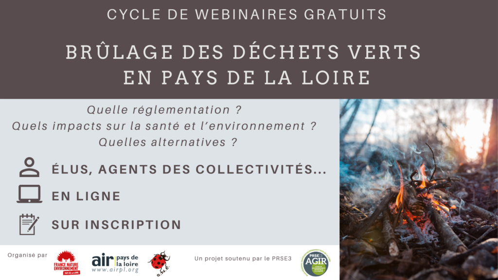 FNE Pays de la Loire, Air Pays de la Loire et Sarthe Nature Environnement organisent un cycle de webinaires en Pays de la Loire. Objectif : sensibiliser et échanger sur le sujet de la réglementation concernant le brûlage des déchets verts. Ces webinaires sont réalisés dans le cadre du Plan Régional Santé Environnement 3 (PRSE3) avec le soutien financier de la DREAL des Pays de la Loire.